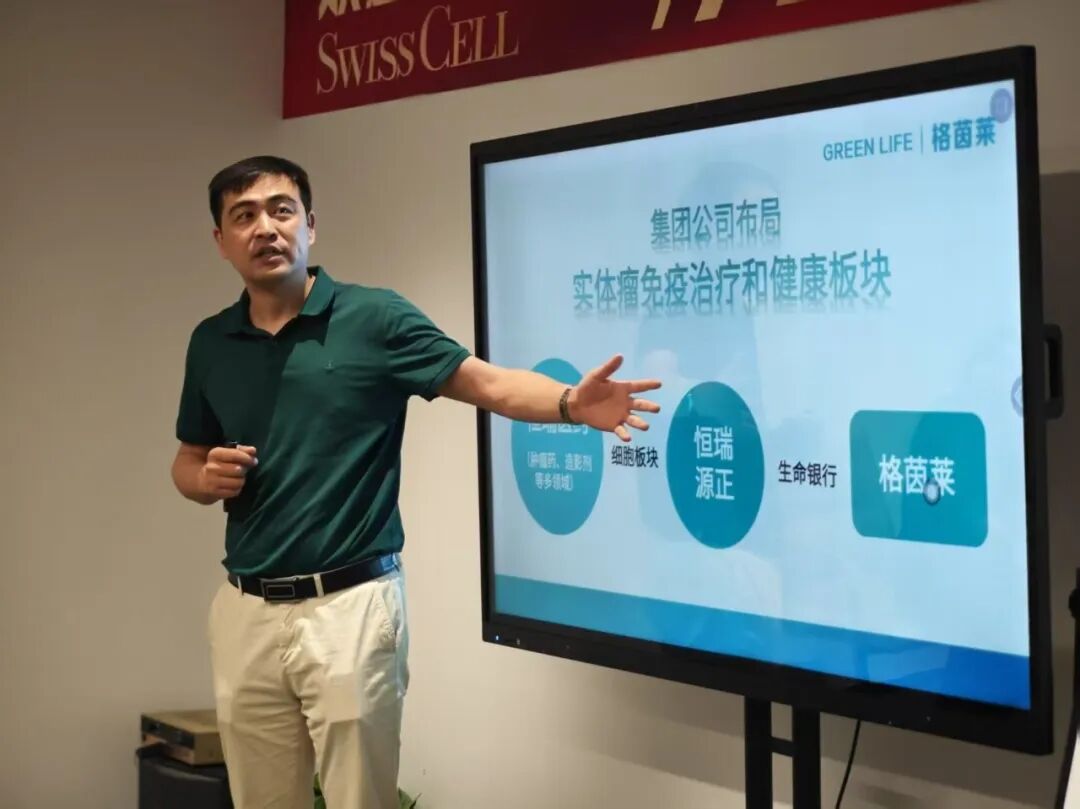 接下来由格茵莱负责人翟总为大家介绍公司及业务范畴,恒瑞医药(格茵莱)一直致力研发防癌抗癌、免疫细胞、干细胞,在中国药企排名前10,翟总深入浅出地为大家讲解防癌抗癌药及免疫细胞、干细胞药的作用,由于市面上也流通着琳琅满目的类似产品,例干细胞,我们外行人难以甄别,翟总的讲解让大家恍然大悟,提高了认知也普及了药理常识,并起到拨乱反正的作用。